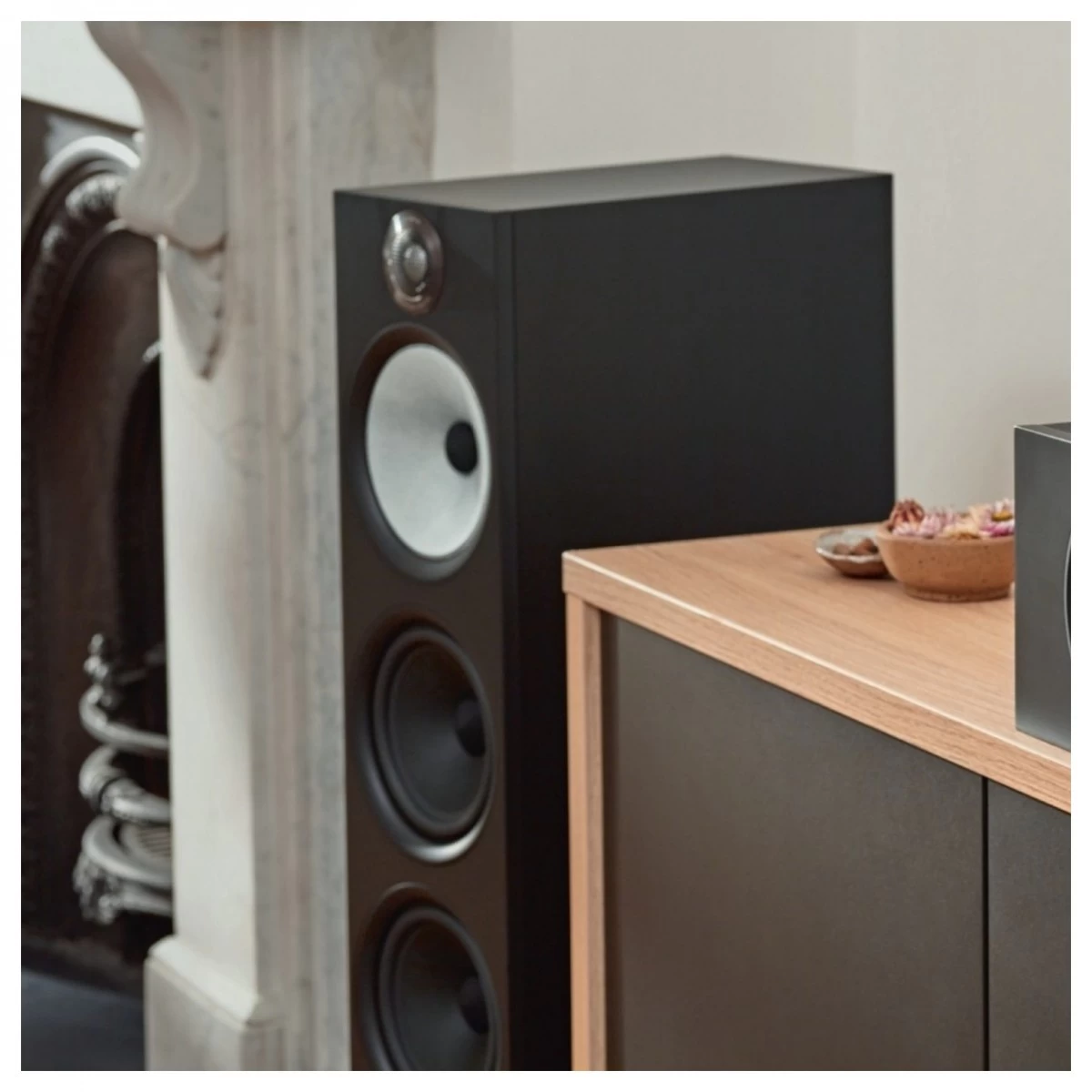 - Available in three stylish finishes: Black, Oak, and White, each with a grille embossed with the Bowers & Wilkins name.