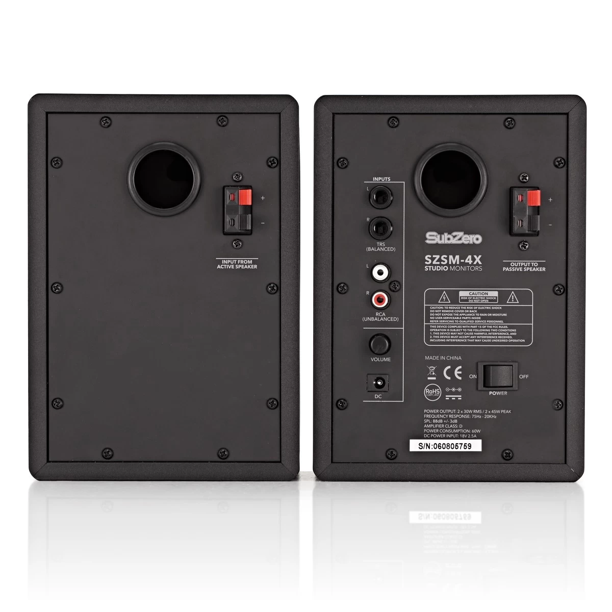 You’ll be provided with a hybrid set up of one active and one passive monitor. The SZSM-4X pair feature 4″ drivers with a magnetically shielded mineral-filled polypropylene cone with a high temperature voice coil and a dampened rubber surround. This will provide you with an even, punchy low end, even at high volumes. Combined with the 3/4″ magnetically shielded ferrofluid-cooled natural soft dome tweeter and the 2.7KHz crossover, these monitors will give clear and reliable sound, time after time.