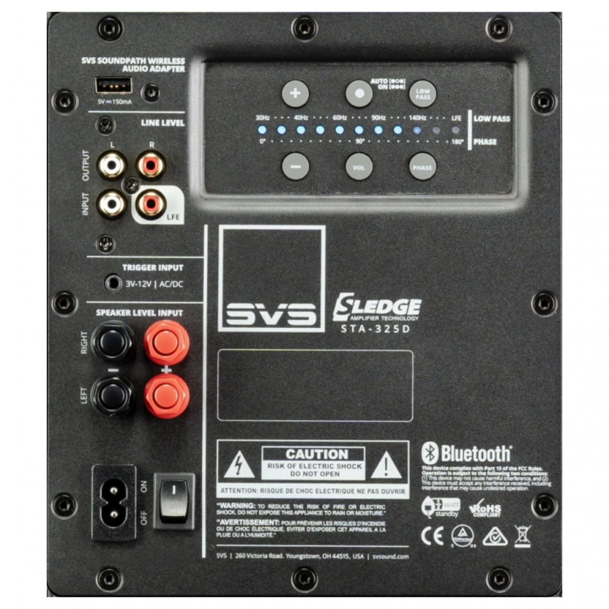 adjustable low pass, phase, polarity, room gain compensation, and control for best alignment with speakers |